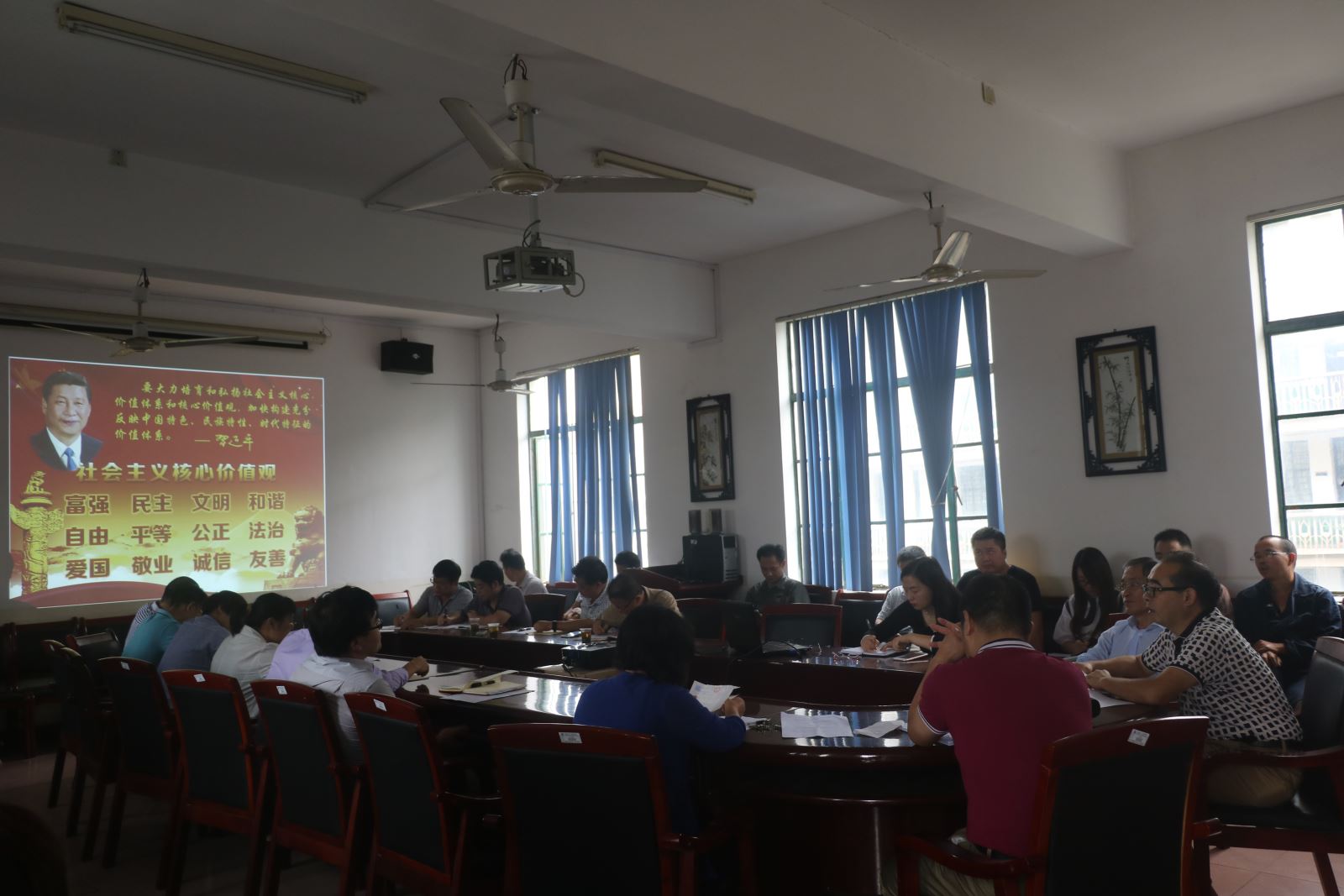 胡爱钦首先传达了学校创建全国文明城市迎检动员大会精神。他指出,今年是湘潭创建全国文明城市的关键之年,是决胜的关键阶段,对于即将迎来的创文工作国检,学校领导高度重视,而对于创建文明城市工作,我们每位老师都应该积极配合,继续努力,凝心聚力,严格对照标准和要求,切实抓好工作落实。随后,胡爱钦仔细解读了《创建文明城市,做文明湘潭人承诺书》的具体内容,同时带领全体教职工系统学习了《2017年湘潭市创建全国文明城市调查问卷》,并要求全院教职工理解并熟知社会主义核心价值观。