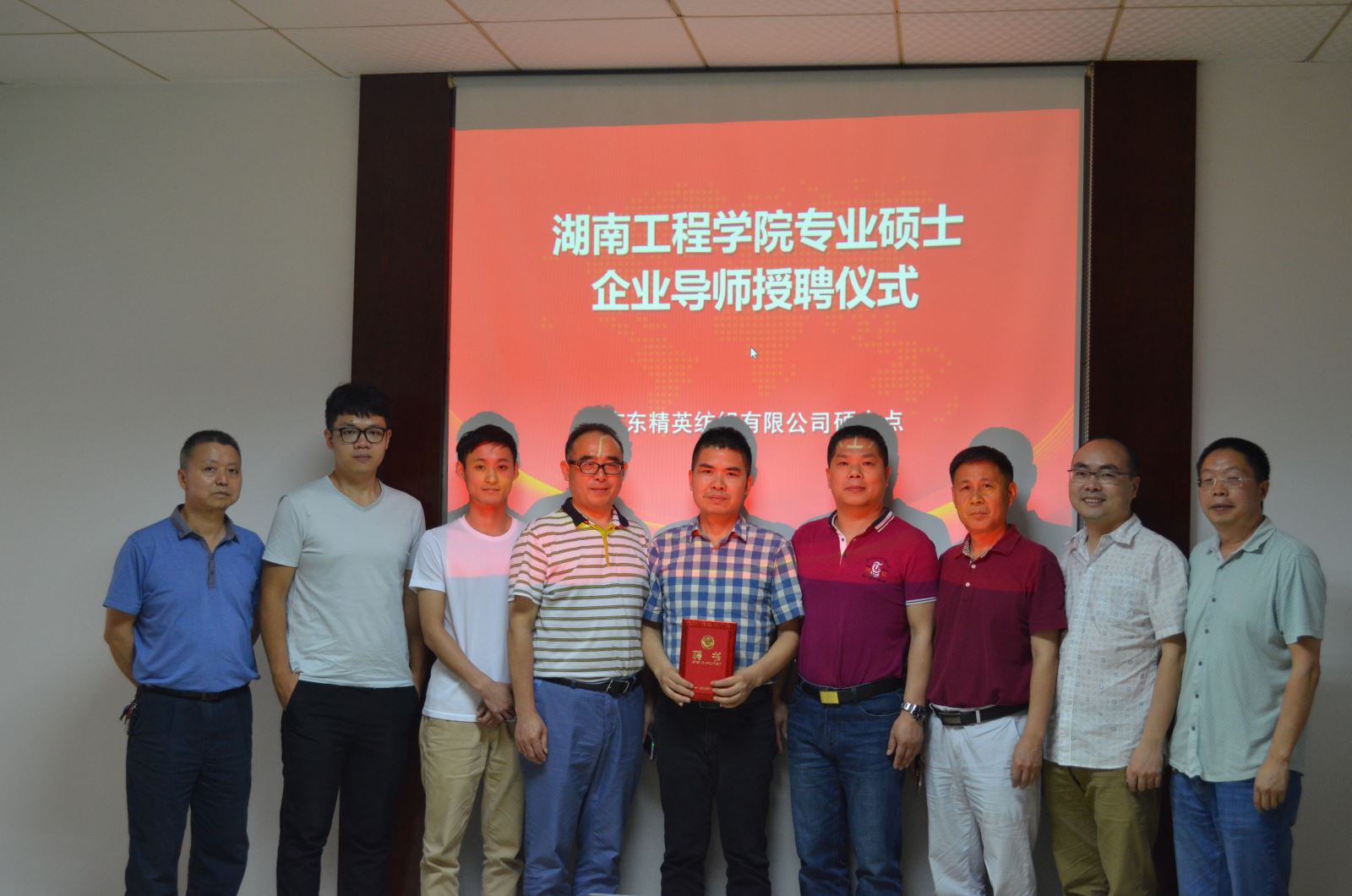 2017年5月19日,受学校委托,化学化工学院院长邓继勇、书记胡爱钦、轻化工程教研室主任陈镇及硕士生导师翦育林教授一行四人来到广东肇庆,代表伟德国际victor1946研究生处向我校87届优秀校友——现广东精英纺织有限公司董事长彭太平先生颁发硕士导师聘书,正式聘请彭太平为我校纺织工程专业硕士研究生企业导师。