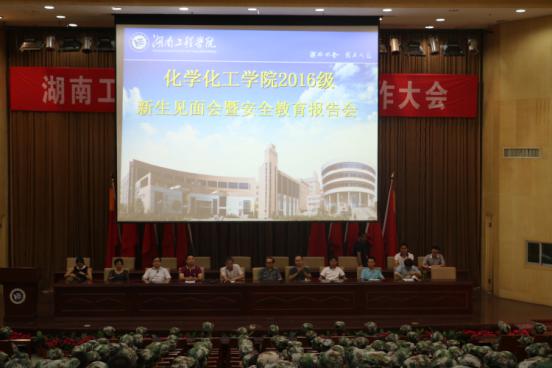 2016年9月18日上午8点20,化学化工学院于图书馆一报告厅召开了新生见面会暨安全教育报告会议。化学化工学院院长邓纪勇,副院长张何,陈建芳,党总支书记胡爱钦,党总支副书记张建国,各教研室主任,学办主任以及学办全体老师参与了此次会议。