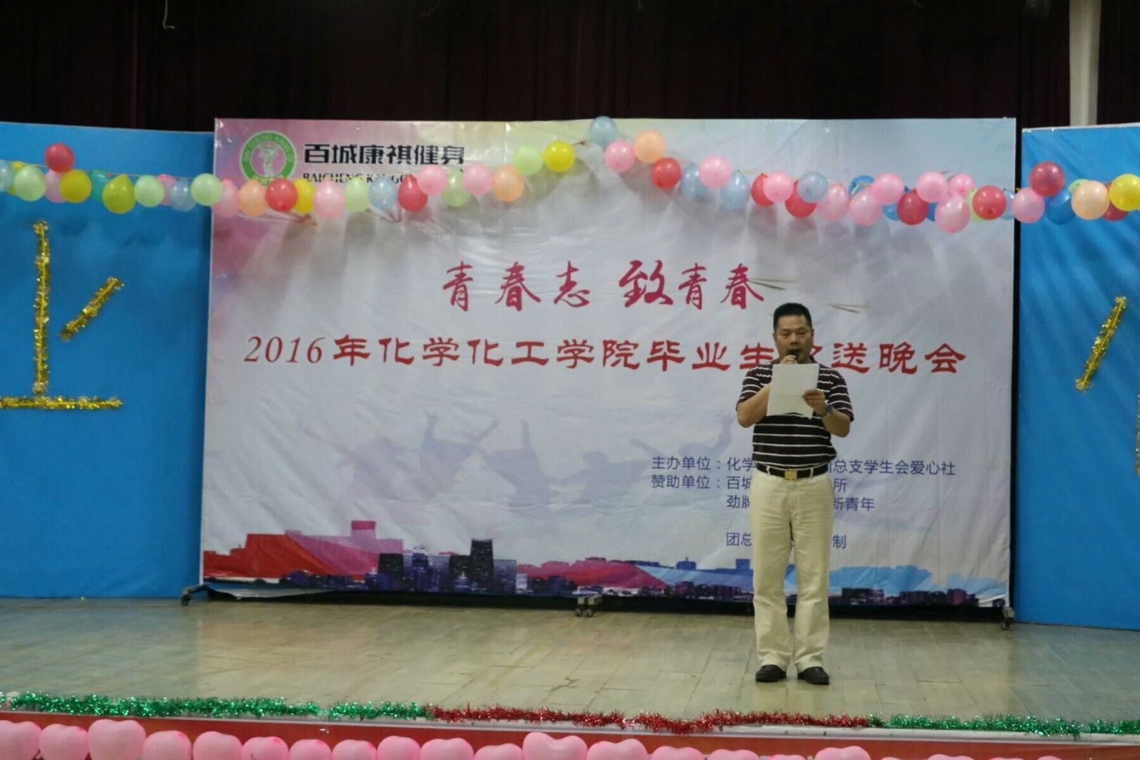 2016年6月11日晚7点30,伟德国际victor1946化学化工学院“青春志,致青春”毕业生欢送晚会在新校区明德二食堂三楼活动中心盛大举办。本次晚会历时约2小时,化学化工学院院长邓继勇,党总支书记胡爱钦、副书记张建国,学办主任吴菲及全体学工办老师应邀参加,现场座无虚席。