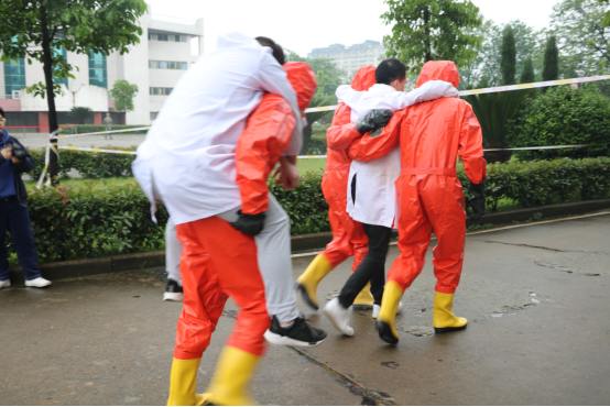 下午2点45分,演练总指挥化学化工学院党总支书记胡爱钦下达演练开始指令,正在实验室写毕业论文的学生向实验室主任谭正德报告险情:实验楼315室发生火情并产生毒气泄漏,谭正德立即将现场情况向学院分管院领导张何副院长以及学院其他领导报告,张何立即指示李飒爽老师向保卫处和后勤处报告和请求救援;同时相关人员拉响警报,正在上课和进行论文指导的教师紧急安排不知情的学生进行疏散,化学化工学院、国资处、保卫处和后勤处的领导及时处置,安保人员关掉用电总闸,消防人员紧急达到现场进行灭火和现场处置,所有学生做到了有序撤离,到达学海花园安全区域。期间,消防人员与专业老师陆桂军、颜东等根据火源化学成分,快速制定灭火方案:消防人员向远离火源抛四氯化碳灭火包,近距离用黄沙,最后用石棉吸附残留的液体(丙酮)。随后,现场应急救援抢救组织展开工作,应急抢救伤员,并组织医务人员对伤员进行及时的治疗。待火势扑灭,警报解除,现场人员对现场进行取证、检测、评估等工作。