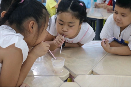 最后一个实验,是“清水”变“牛奶”。每个小朋友面前有一杯“清水”和一根吸管,当孩子们用管子对着“清水”缓缓吹气,不一会,“清水”就变成了乳白色的液体。“这简直太神奇了!”黄老师和“助教姐姐”跟同学们解释说,“这杯‘“清水’其实是生活中常见的石灰水,嘴巴里吹出气体会和石灰水发生反应,从而变成‘牛奶’。”