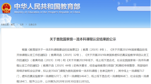 10月30日,根据《关于首批国家级一流本科课程认定结果的公示》,我院由方正军副教授作为负责人的《无机化学》课程被认定为线下一流课程,成为3560门首批国家级一流本科课程之一。