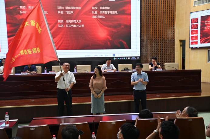 在会旗交接仪式,何福林代表下一届承办单位湖南科技学院从易兵手中接过了会旗。