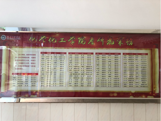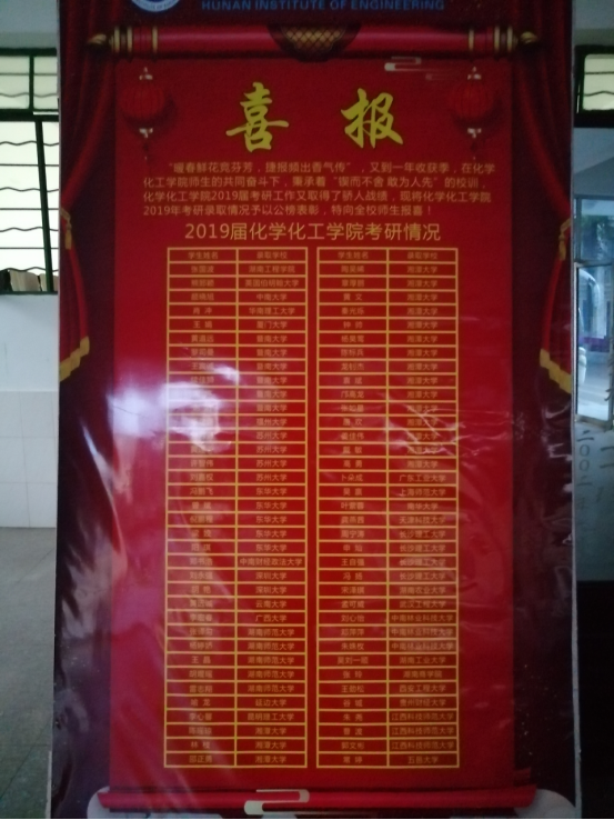 人生几多无奈,总有苦尽甘来。只要奋力前行,成功不会缺席。只要跟上节拍,就有梦想舞台。而人生之光荣,不在永不失败,而在于屡仆屡起。历届考研人义无反顾,勇往直前,虽“研”途艰苦,但心怀火热的梦想,从绝望中寻找希望,从失意中找寻定力,绝不做命运的玩偶。一位位勇士凭着过人的实力,在学院专门设立的考研荣誉榜上画下浓墨重彩的一笔,给自己的考研经历添上一个完满的句号,为接下来化工院的应届考研学子树立优秀的榜样,激励化工人奋发向上,也为化工院的考研事业开启更美好的篇章。历届考研录取的学子已成功攀顶,也已纷纷离开了化工院,去继续追逐更大的梦想,但是化工院专门设立的考研荣誉榜永远地记录了历届考研人艰苦奋斗、坚持不懈的考研精神,也弘扬了化工人吃苦耐劳、务实力行的优良品质,同时也体现了化工院对考研事业和建设良好学风的重视。