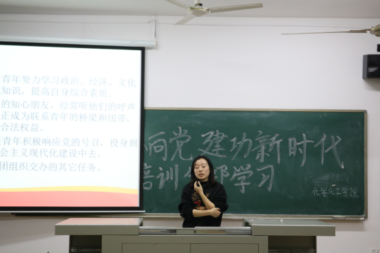 首先,柳芊为同学们讲解了共青团的定义,随后又介绍了团徽、团旗、团员证和团歌等共青团相关物品的由来。接着她又介绍了团支书的主要工作,让团支书们再一次了解他们的责任,其中她还说到,团支书就是服务群众的,要多去了解团员想要的。最后,柳芊带领同学们一起高唱团歌,在这热烈的氛围下,同学们共同观看中国共青团公开课视频,一起了解和学习共青团的光辉历史。此次团校培训也到此结束。