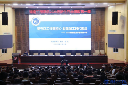 10月10日下午,我院2023级新生在一报告厅共同上了第一堂思政课。党委副书记、校长易兵教授以“坚守以工许国初心,彰显湖工新时代担当”为题,从“立足新时代,深刻把握好教育、科技、人才工作的重要意义”“锲而不舍七十二载 敢为人先以工许国”“擦亮‘工’字品牌 更好服务中国式现代化”“坚定理想信念 争做新时代好青年”四个方面展开讲授。