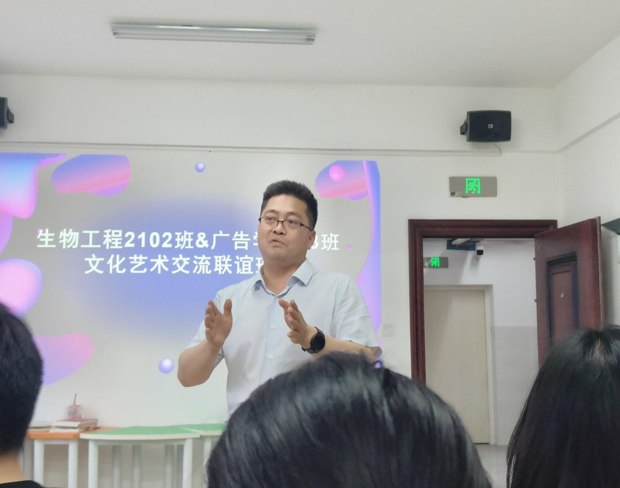 生物工程2102班班主任徐粤宇首先发言指出本次联谊班会开展的意义:其一是加强各专业之间的联系,让各位同学在大学期间结识更多志同道合的伙伴;其二是通过对不同专业的深入了解后取长补短,学习对方专业的优势,取长补短;其三是劝诫同学们珍惜大学时光,勇敢追梦,不虚度光阴,不负青春,不负韶华,砥砺前行!