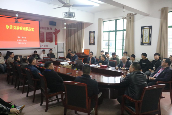 邓继勇介绍了学院与东莞市永佳合成材料有限公司的合作历史,对彭彦校友饮水思源、回报母校表示衷心感谢。毛浩民通过PPT介绍了公司的详细情况。随后,彭彦结合自己大学时期的经历,建议同学们对自己要有清楚的认识,积极地为自己的未来做打算,制定目标,同时激励同学们努力学习,为将来打下坚实的基础,“希望你们不怕失败,努力奋斗,创造无悔人生”。他的发言亲切诚恳,鼓舞了在场的每一个同学。讲话结束后,彭彦宣读了获奖名单,为获奖同学颁奖。