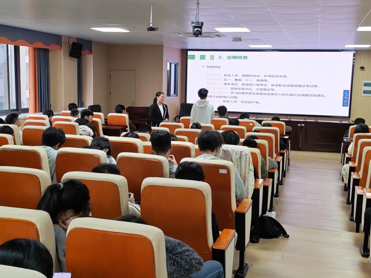 其次,针对心理工作开展方式,黄老师提出三点实践建议:一是鼓励参与多样化心理健康活动;二是建立定期排查机制,心理委员与寝室联络员需常态化关注同学情绪变化,并及时沟通关怀;三是明确求助途径,详细介绍学院成长辅导室、学校心理健康中心的预约方式与服务内容,引导学生主动寻求专业帮助。