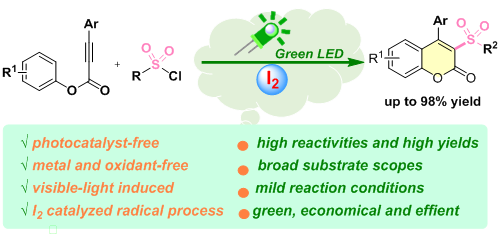 近日,我校伟德betvlctor1946源于英国2019级研究生王强在光催化有机合成研究方面取得最新进展,相关研究成果以“Visible light mediated, iodine catalyzed radical cascade sulfonylation/cyclization for the synthesis of sulfone-containing coumarin under photocatalyst-free conditions”为题在国际有机类主流期刊《Asian J. Org. Chem.》(影响因子3.319)上发表。指导老师/通讯作者是易兵教授,共同通讯作者还有谭建平博士和谢艳军博士。