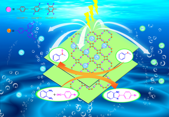 针对光催化促进电荷分离的问题,该工作提出氟功能化策略,将具有含氟单元的受体与给电子单元咔唑光敏性基团桥接,成功制备了一系列结构新颖、孔结构特性可调、光电性能可控的氟功能化共轭微孔聚合物,满足了光催化合成苯并咪唑衍生物和硫化物氧化的能带和能级需求,收率高达99%。