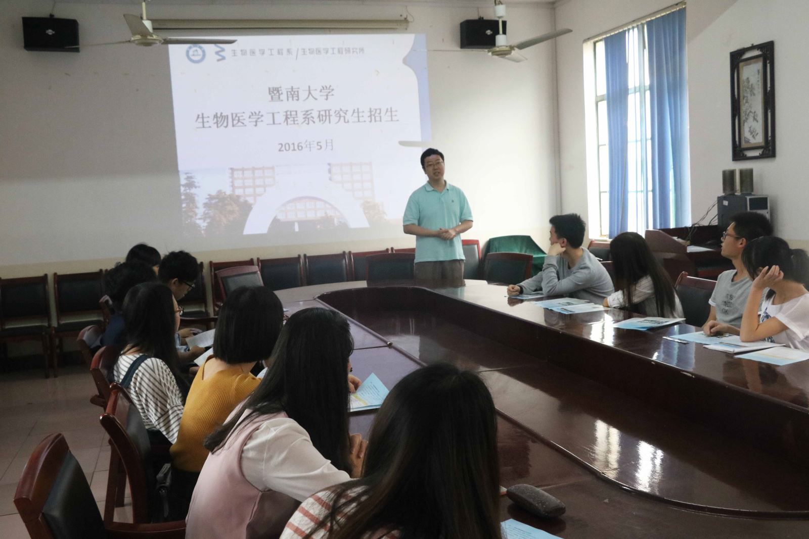 宣讲会分为考研形式分析及现场答疑两个环节。宣讲会中,马栋结合ppt向同学们介绍暨南大学生物医学工程学科概况。他从学院地理位置、教学投入及对外办学理念三个方面出发,表明了暨南大学拥有强大的科研办学条件,是考研学子的不二选择。紧接着,他着重从生物医学工程学科的师资力量、科研条件及奖助学金三方面表明学院的的“硬件”优势,强调生物医学工程学科是“211工程”建设重点学科方向,先后投入近3000万经费,仪器设备齐全,拥有一整套严谨、科学的科研治学程序。