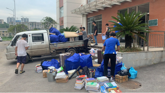 早上8:30搬迁工作准时开始,同学们有条不紊的将自己前一天晚上打包好的行李搬至楼下。夏日炎炎,头顶的太阳没有一丝松懈的想法,虽然同学们早已热的汗流浃背,但是依旧没有停下手中的工作。现场有许多已经搬完自己行李的同学没有选择休息,而是选择帮助其他没有搬完行李的同学。
