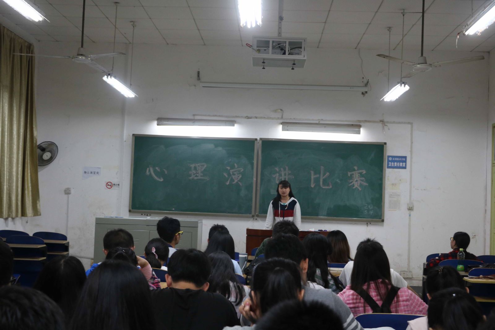比赛现场井然有序,我院16名选手依次上台讲述自己与心灵的故事。来自材化1501的唐雪媛以一个女生视角,从把控情绪的角度出发,阐述她对于心理健康的看法,并列举了三条如何自我调整情绪的办法。严谨的逻辑,行之有效的方法,为演讲加分不少。来自高分子1502的魏双琳一上台便用十分从容的台风以及极富感染力的气场吸引场下听众,她结合自己所遇到的心理问题,表达对心理问题的看法,并给出解决的方法。来自来自化工1501的向川婷则以自己为例子,表达了术业有专攻,不要因为别人在某方面超过自己就一蹶不振,学会发现自己的优点和长处,过积极向上的人生,这才是当今大学生所该持有的态度。台下的同学在感同身受的同时也为台上这个身形瘦弱却蕴含巨大正能量的女生回以热烈掌声。