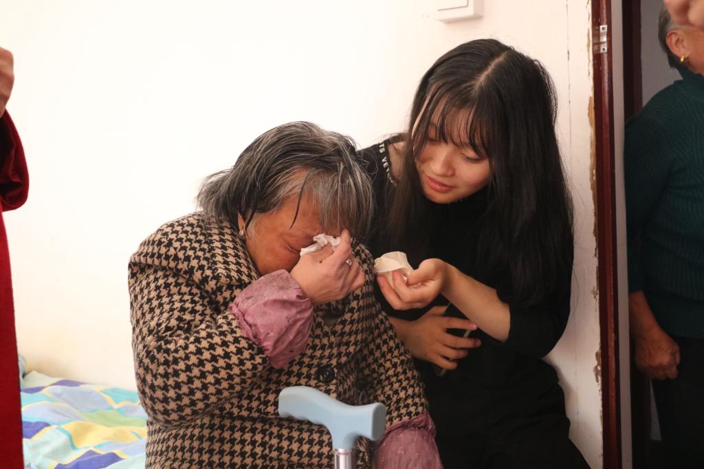 岁月的峥嵘在老人脸上留下了皱纹,此时却显得稚气而生动,同学们一边耐心真挚地安慰老人,一边用纸巾轻轻地为老人拭去眼泪。在与志愿者们海阔天空地聊天中,老人的脸上不一会就出现了淡淡的微笑,与志愿者们一起唱起了歌。