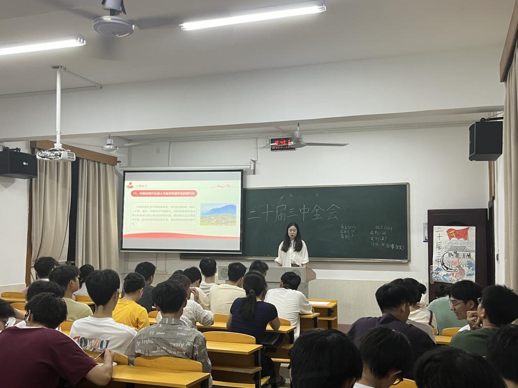 活动伊始,化工2202班团支书带领同学们一同了解中国共产党第二十届三中全会,从会议的背景到重要决策,从宏观的国家发展规划到对青年的期望,她的讲解循序渐进,让同学们对党的二十届三中全会有了更深刻的认识,也凸显了青年人在新时代背景下的责任与使命。她说:“我们应当积极参与社会实践,将所学知识运用到实际中,为家乡的发展贡献自己的力量”。