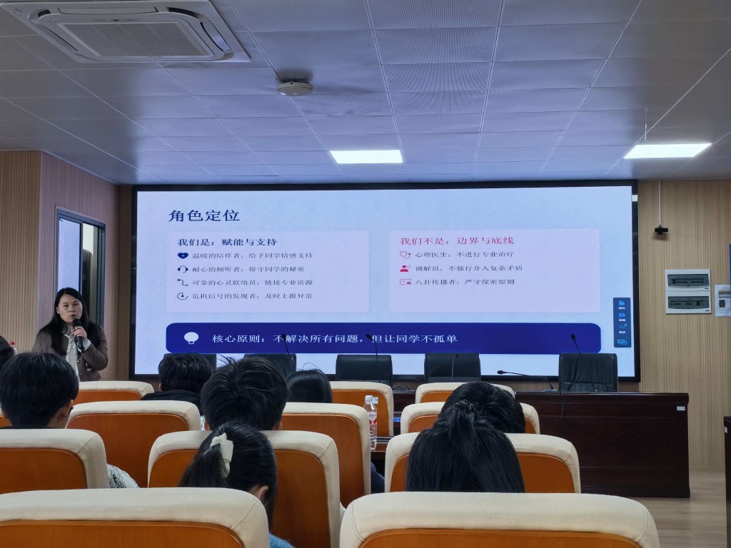 为健全学院心理健康防护网络,提升心理委员、寝室联络员的工作能力,明确心理工作边界与职责,3月25日,伟德betvlctor1946源于英国面向全体心理委员和寝室联络员开展心理健康专题培训,切实筑牢校园心理安全防线。