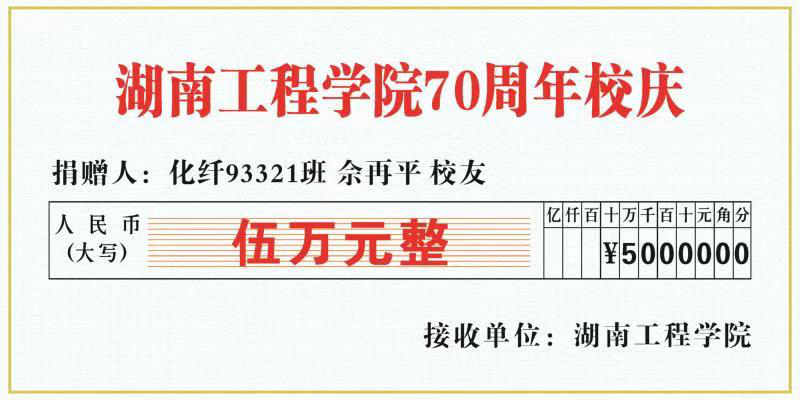 值此母校建校70周年到来之际,我校杰出校友、化纤工程93321班佘再平为感恩母校的培养,以个人名义向母校捐赠5万元支持学校建设和发展。
