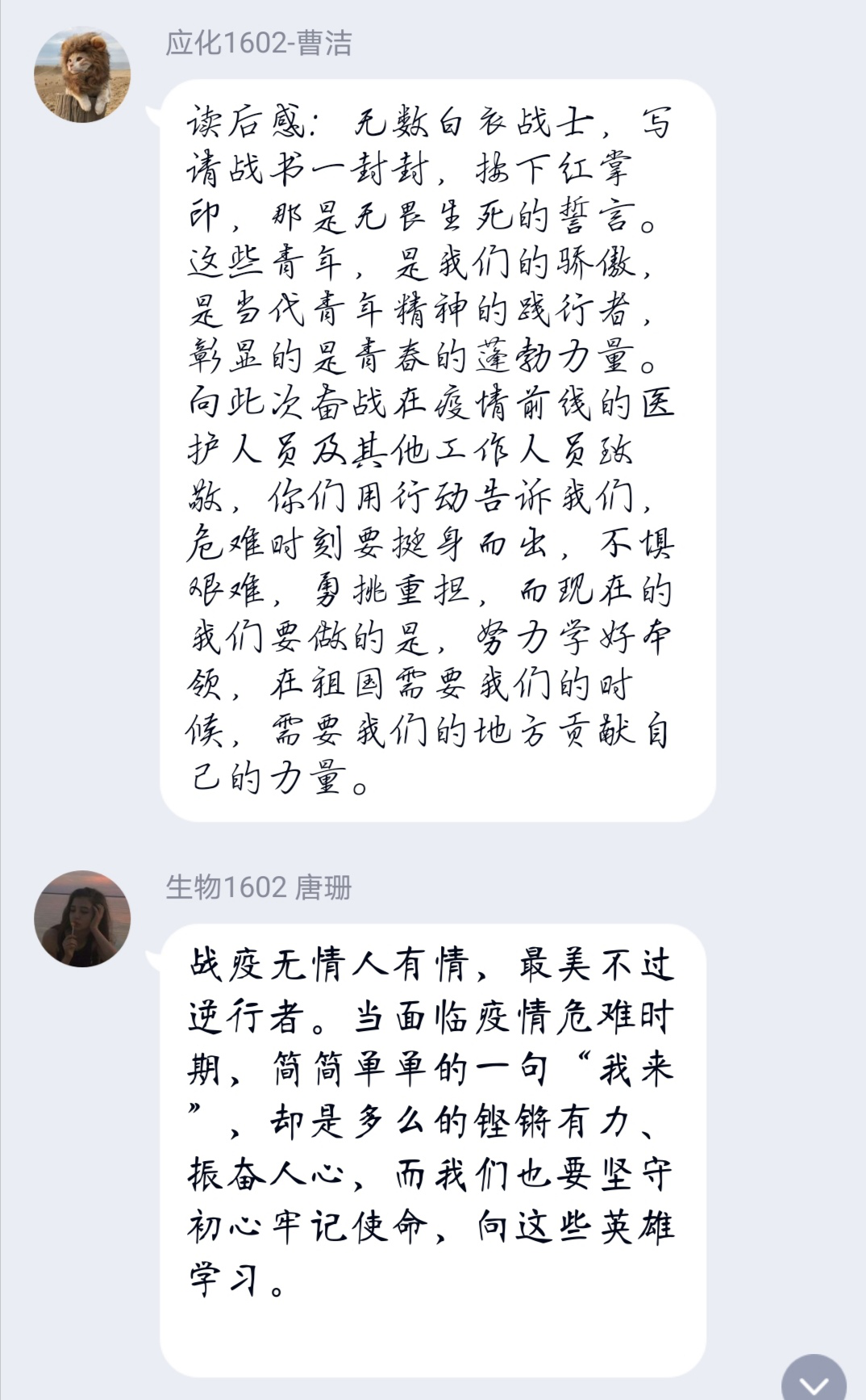 “战疫无情人有情,最美不过逆行者。当面临疫情危难时期,简简单单的一句“我来”,却是多么铿锵有力、振奋人心,而我们也要坚守初心牢记使命,向这些英雄学习。”党员唐珊表示。“在疫情过程中,患难见真情,共同抗疫情,无数90后与党员冲锋在战疫一线。而我们作为青年一代应当有理想、有本领、有担当,国家就有前途,民族就有希望。在未来的日子,做好新时代青年,学习新思想,练就过硬本领,将来在党和人民需要的地方发光发热。”发展对象刘敏说。