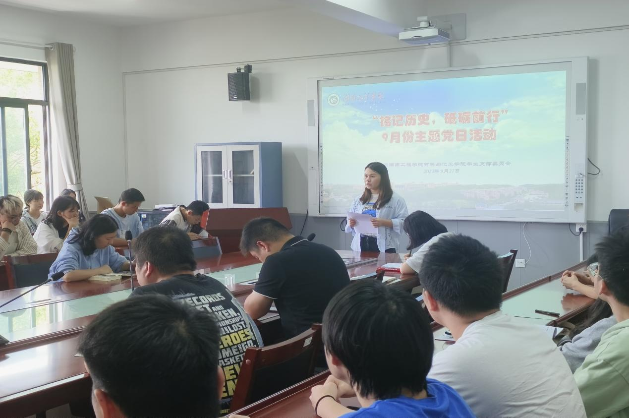 本次主题党日以“一课”和“一片”多个环节深入学习抗战历史和伟大抗战精神。党员黄玉娟向党员同志领读中国人民抗日战争期间的重要历史事件;学生第二支部书记王祥若领读习近平主席的八一讲话。讲话强调了中国共产党对抗日战争胜利的重要贡献以及继续传承革命精神的必要性。学生第三支部书记刘思博老师分享了深入的历史研究成果。他回顾了中国人民抗日战争的各个阶段,强调了不同背景的人们如何共同抵抗侵略,呈现出一种团结和协作的力量。他指出,抗日战争不仅是中国的骄傲,也是世界反法西斯战争的一部分,为全人类的和平和自由事业做出了杰出贡献。他强调,虽然今天的时代不再以军事斗争形式出现,但斗争的需要和抗争的决心仍然存在。